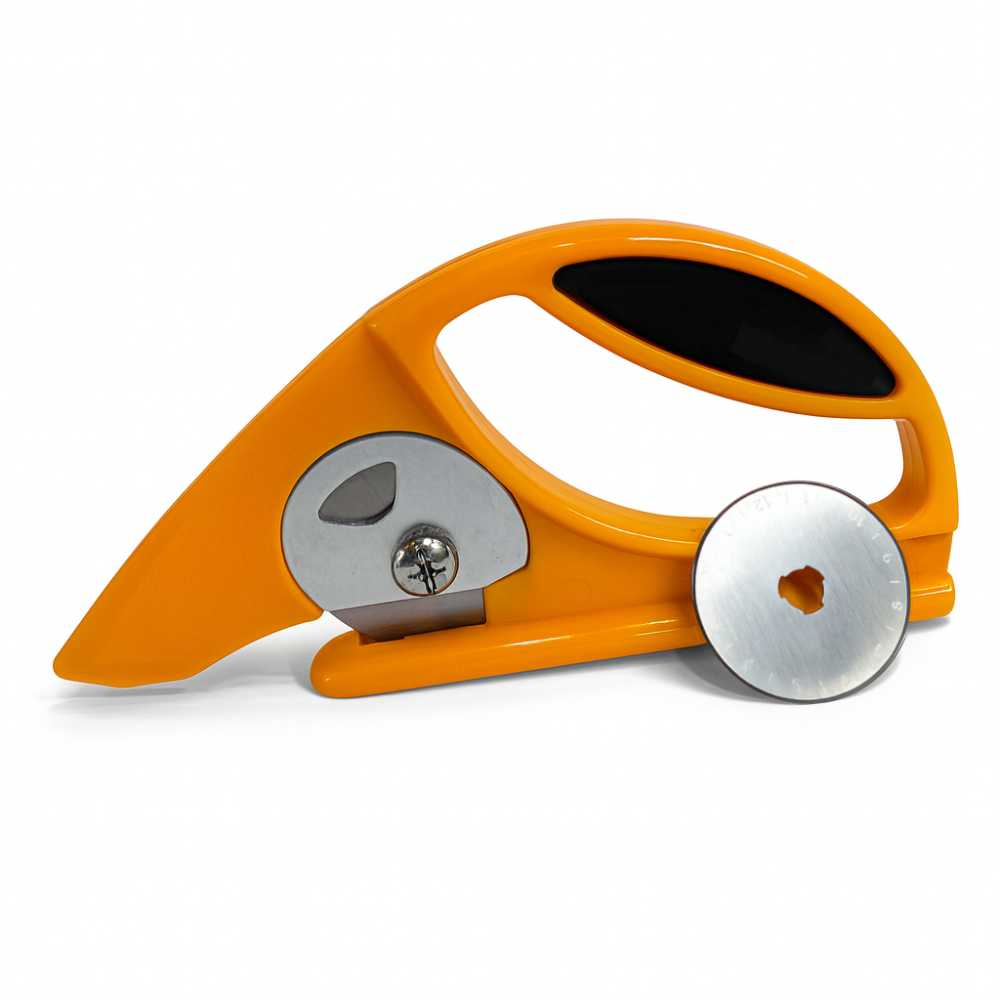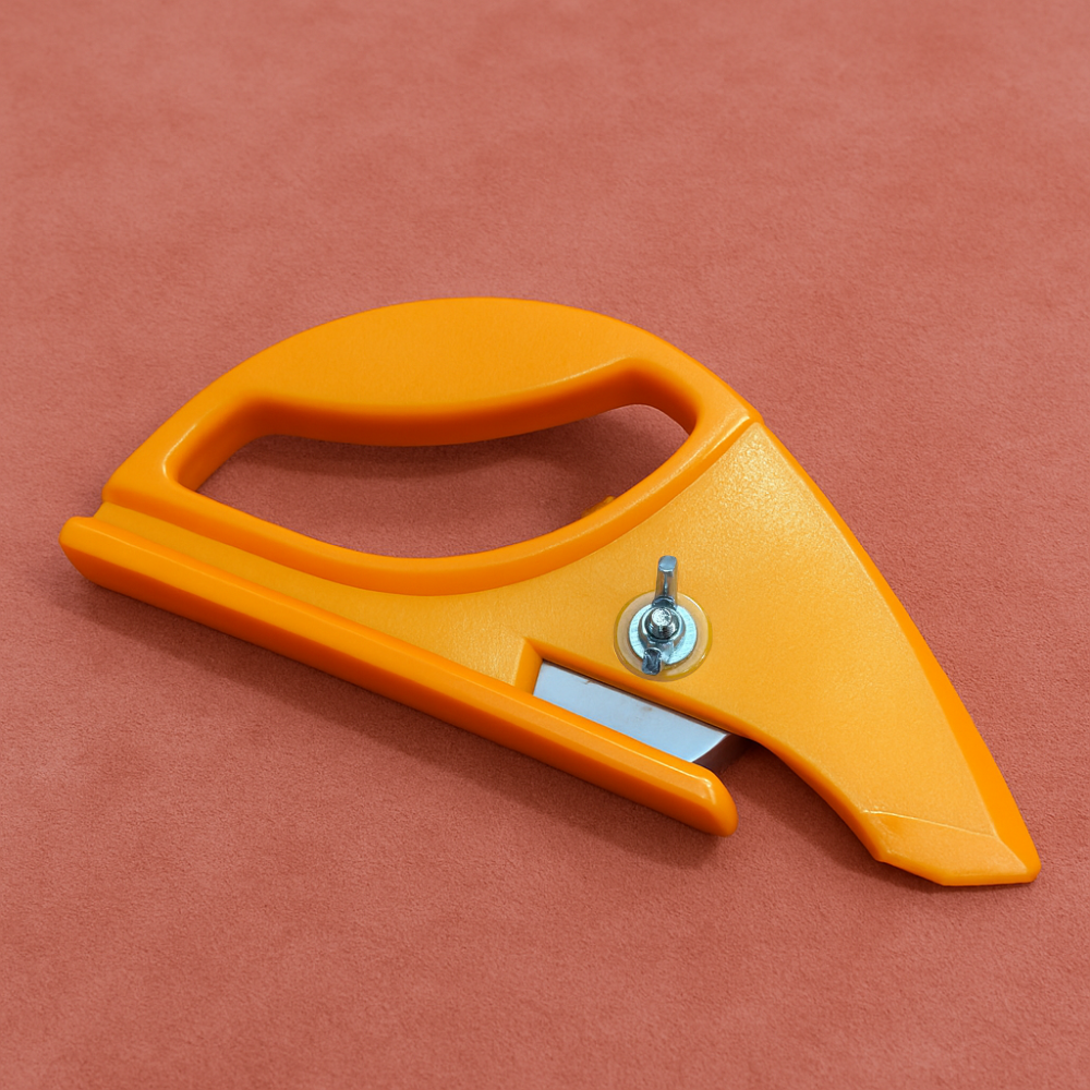 place it on the leather and push forward. The front tongue presses the material down, while the bottom guide lifts it slightly, keeping your surface protected. This guiding system holds the leather in the perfect position against the sharp circular blade, delivering smooth and precise cuts every time.