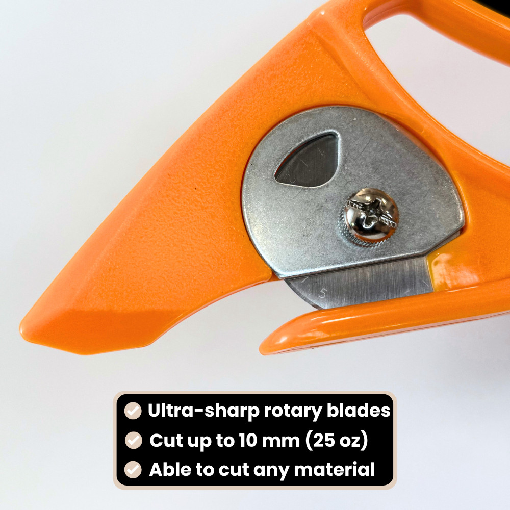 With sharp blades and a reinforced design, it can cut through any material up to 10 mm (25 oz) thick.